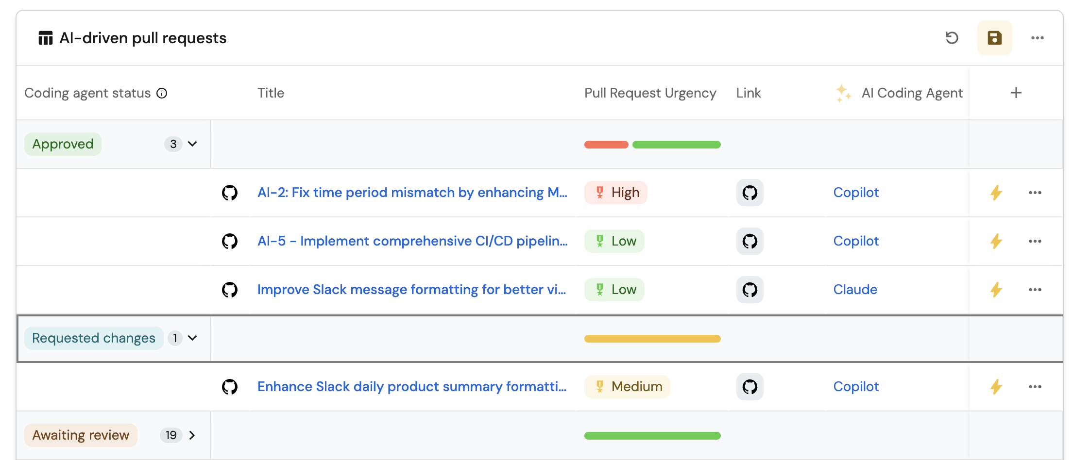 The AI-driven pull requests should now appear in your AI Control Center dashboard, properly categorized and grouped by work status.